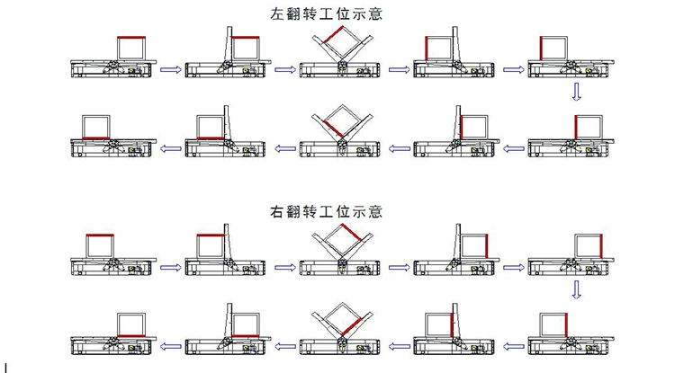 Două bucăți de flip-uri mobile cu fascicul hidraulic de 180 ° sunt utilizate pentru întoarcerea pieselor de lucru sudate pe o parte. Când lucrați, ridicați piesa de lucru departe de masa cu role sau de pe suportul de lucru, iar reductorul îi determină pe cei doi flippers de fascicul să se deplaseze sincron pentru a muta piesa de lucru pe partea laterală a mesei cu role sau a suportului piesei de lucru, iar apoi doi cilindri hidraulici conduc cele două brațe pentru a se roti sincron, mutați piesa de lucru în mijlocul mesei de lucru sau a rack-ului de lucru.